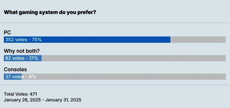 硬件媒体WCCF读者调查,75%的人选择了PC作为游戏平台