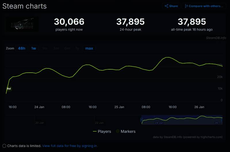 《最终幻想7》重制三部曲第二部《最终幻想7:重生》现已正式登陆PC,其中Steam版首发同时在线玩家数量峰值达到了37895,超越了前作《最终幻想7:重制版》的数据13803,成为了Steam上《最终幻想》系列玩家同时在线数量峰值最高的游戏(单机游戏,《最终幻想14》除外)。
