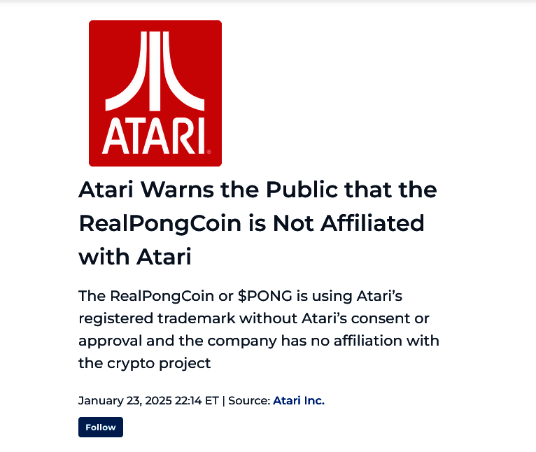 新闻稿写道,这款货币“未经雅达利的同意获批准”,公司与该货币项目“没有从属关系”。公司还警告称,该货币可能会欺骗玩家其与雅达利有关。目前公司的法律团队正在积极行动,试图阻止 IP 被滥用。