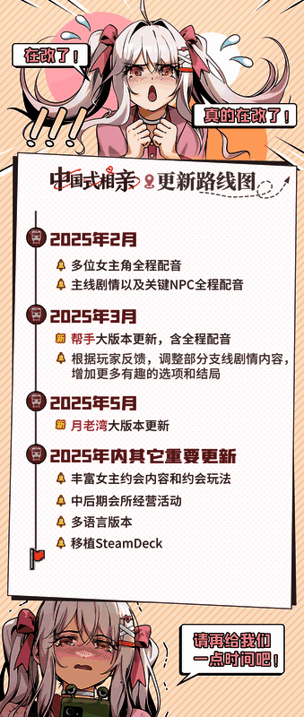1月26日,开发商LightningGames发布了《中国式相亲》2025年更新计划,其中包括配音、大版本更新、Steam Deck移植、多语言版本等等内容,开发者称2025年他们将严格按照线路图推进开发,不辜负玩家的期待。
