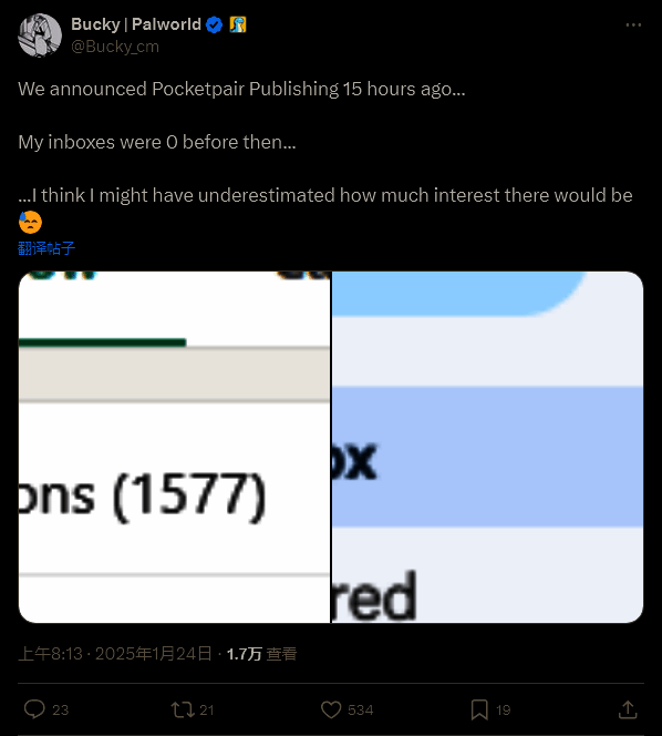 这家公司本周早些时候推出了 Pocketpair Publishing 发行部门,并宣布将与 Surgent 工作室达成首个合作关系,开发一款恐怖游戏。Bucky透露,在该消息宣布的 15 小时内,他就收到了 1600 多条希望与其合作的小型开发者的合作请求、邮件以及提案。同时,他的社交媒体账号也新增了大量粉丝。