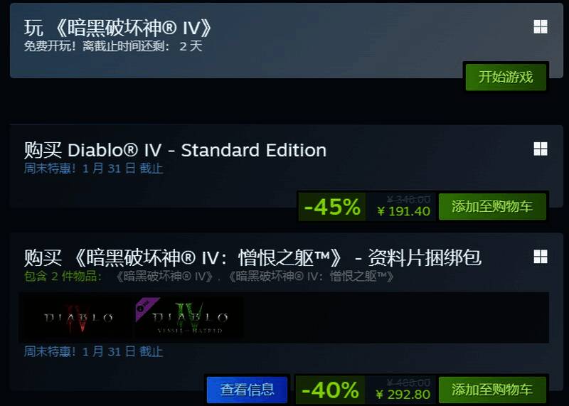 近日《暗黑破坏神4》在Steam上开启史低特惠,国区标准版原价348元,现在打折售191.4元。资料片捆绑包原价488元,现在打折售292.8元。优惠活动将于1月31日结束,还没玩过该作的玩家快来入正吧!