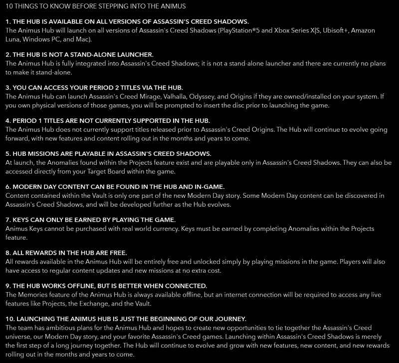 此外《刺客信条:Animus Hub》并非完全独立的启动器(可离线使用),并且育碧方面也暂无将其独立的计划。而在初期推出时暂不支持《刺客信条:起源》之前的游戏,同时也会推出相关的中心任务,玩家可以通过完成任务免费解锁奖励,以及获取无法使用现实货币购买的钥匙物品。