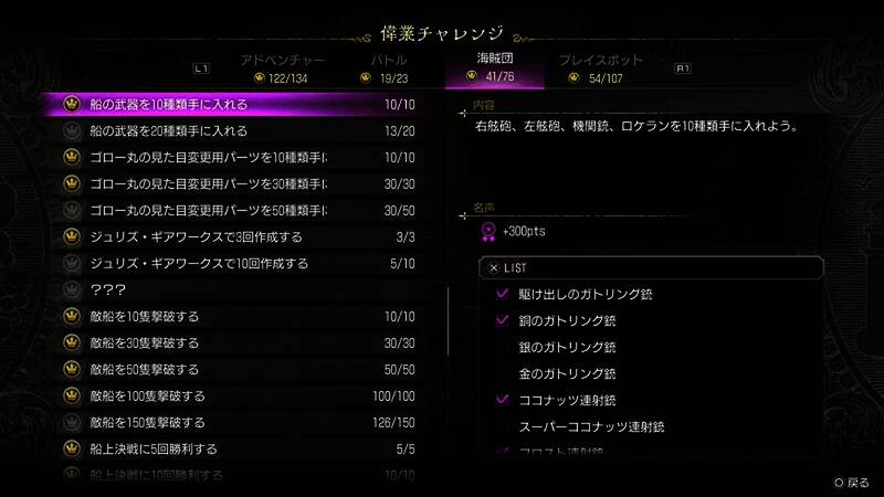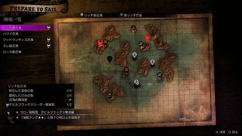 真岛在各地达成成就的同时,可以获得作为海盗的“名声点数”。成就中包括击败敌船、收集财宝等各种各样的内容。随着赚得名声点数的增加,吾朗海盗团的“海盗RANK”将会提升,从而解锁更多的游戏内容。
