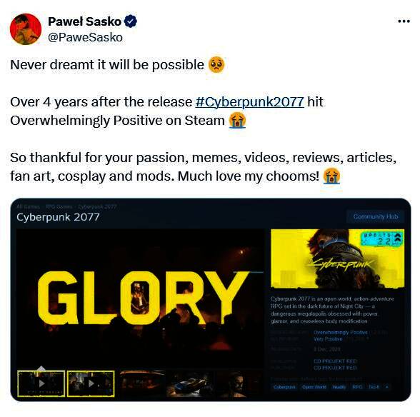 正在开发《赛博朋克2077》续作的游戏副总监Pawel Sasko也在X上分享了这一消息,并表示他从未梦想过这会成为可能,一切都要感谢玩家们的不懈支持。