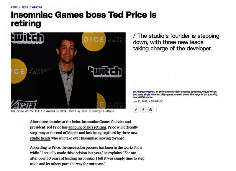 此外,据科技媒体The Verge报道,Insomniac创始人Ted Price即将退休,三名高管(其中之一就是Chad Dezern)将联合执掌这家打造了《漫威蜘蛛侠》、《瑞奇与叮当》系列的SIE旗下第一方工作室。