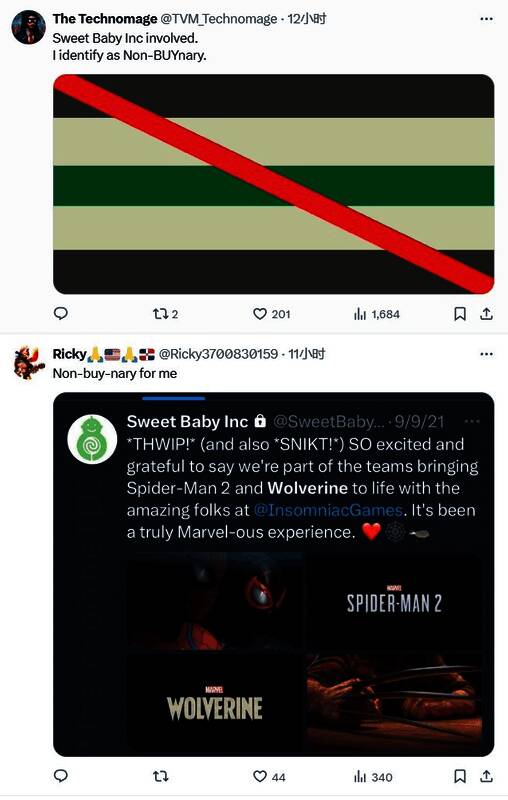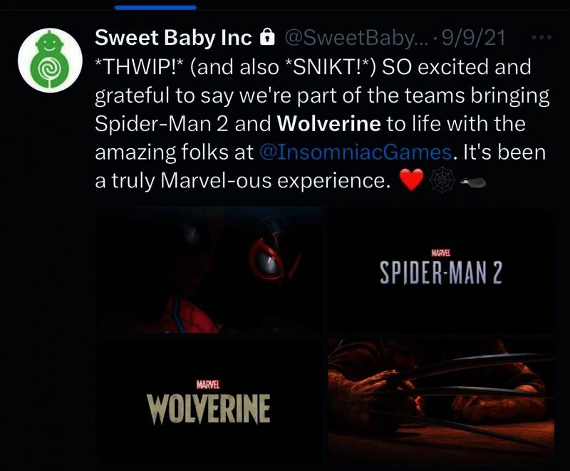 对于《漫威金刚狼》,网友翻出Sweet Baby的旧推文,确认《漫威金刚狼》和《漫威蜘蛛侠2》一样都是Sweet Baby插手的游戏,也都是DEI游戏。