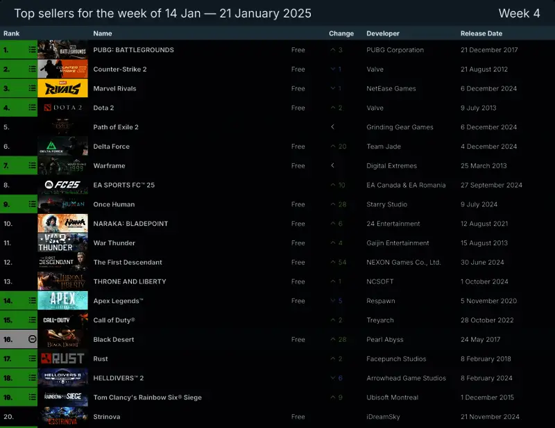 《绝地求生》是 1 月 14 日至 21 日 Steam 上最热门的游戏,其次是《CS2》、《漫威争锋》和《DOTA 2》。进入前十名的仅有 2 款是买断制游戏,分别是《流放之路2》(仅测试付费)和《EASports FC 25》。