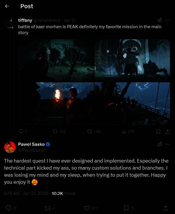 Paweł Sasko在推特上回复玩家称赞凯尔莫罕之战剧情的精彩时,透露了这其实是游戏制作阶段中最困难的一个部分,他说:“这是我设计和实现过的最难的任务。尤其是技术部分让我很头疼,有那么多自定义解决方案和分支。当我试图把它拼凑起来时,我快要疯了,睡不着觉了。(不过)很高兴你喜欢它。”