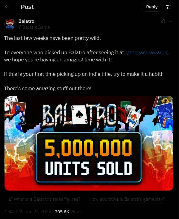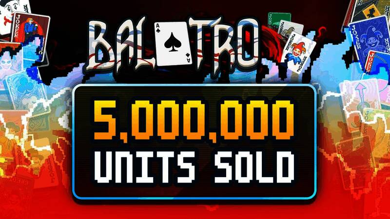 去年热门的扑克牌主题Rougelite独立游戏《小丑牌》,近日在官推发文庆祝,表示游戏已售出超过500万份。