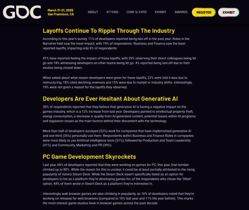 GDC近日公布了一年一度的“游戏行业现状调查报告”,其中透露出了一些值得关注的讯息,例如有11%的受访者在2024年遭到解雇。