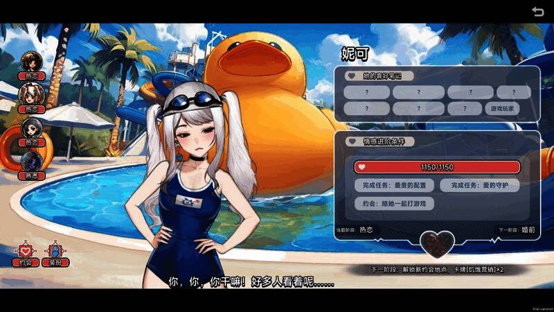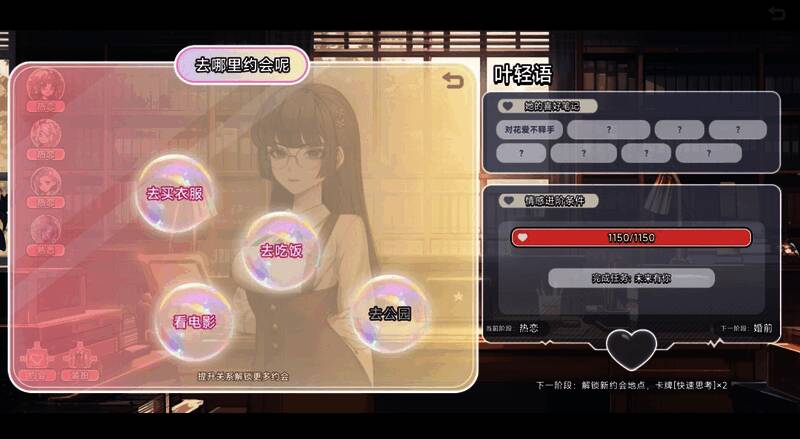 主角将陆续邂逅四位性格迥异,阶层不同的女主,走上不同的情感旅程。如何处理与她们的关系,解决面临的问题,种种抉择将会决定你与谁走进婚姻的殿堂……重新认识多年未归的鹊桥市,锻炼自己的能力,发掘任何对相亲事业有帮助的得力助手或是道具。忙碌之余也不能忘了休息呀!钓鱼、打碟、读书、喝酒、健身,休闲活动应有尽有。在与四位女主发展感情的同时,玩家还要兼顾自家相亲会所的经营状况,去结识单身男女,并说服他们成为自家相亲会所的会员。尽可能满足会员们对另一半的诉求并进行匹配。