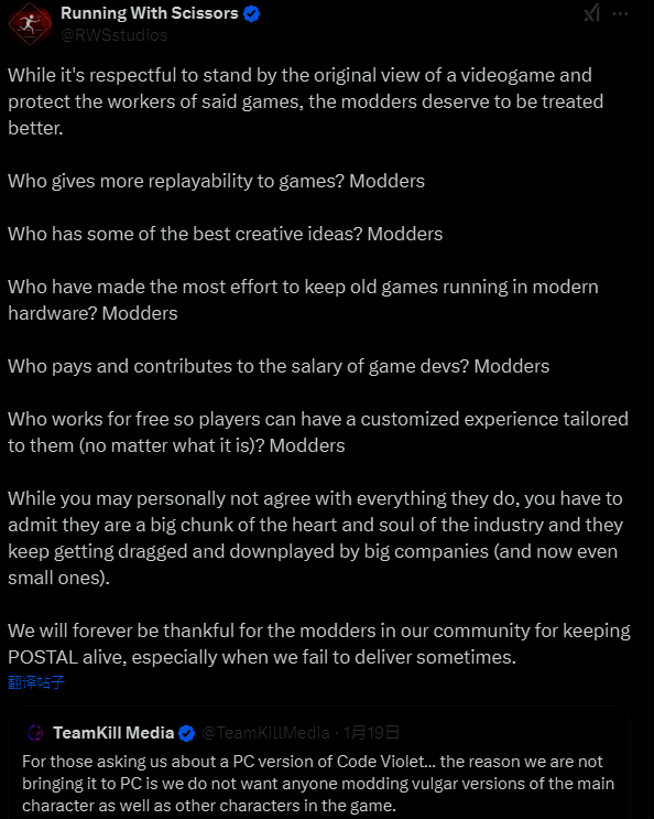 ·姑且不讨论究竟谁对谁错,《传送门》开发商Running With ScissorsはTeamKill表示,(MOD开发的根本)是要尊重游戏原作的创意,守护开发者非常重要,理解TeamKill Media的立场和顾虑,但是呼吁MOD制作者理应获得更好待遇。