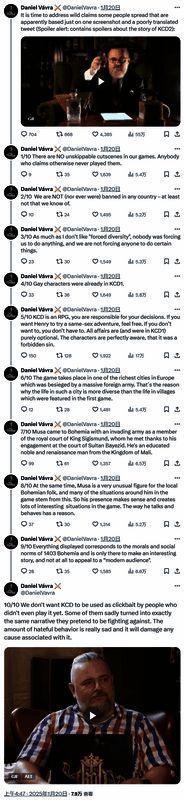 Daniel Vávra在社交媒体贴文上表示,《天国:拯救2》没有不可跳过的过场动画,也从来没有被任何国家禁售(至少目前是这样),游戏没有强制性的DEI内容,开发者不会强迫别人做某些事,也不会有人强迫开发者做某些事。并且在初代《天国:拯救》中就有同性恋角色和内容了,不过不是强制性的,玩家可以自由选择,没有任何束缚。