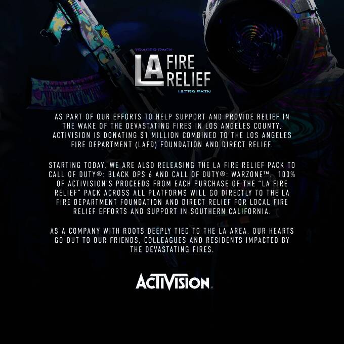 从今天开始,我们还将向《使命召唤:黑色行动6》和《使命召唤:战区》发布洛杉矶火灾救援包。在所有平台上购买‘洛杉矶火灾救援’包所得的全部收益将直接捐给洛杉矶消防局基金会,用于直接救济南加州的当地火灾救援工作和支持。