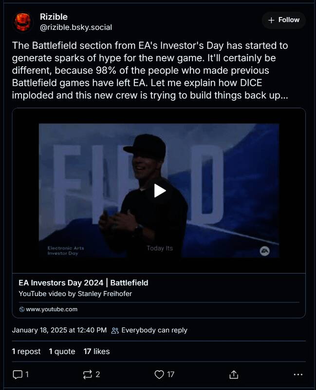 Bluesky用户Rizible发推说,新《战地》将相当不同,因为参与开发之前游戏的员工,98%都已经离开。Rizible称在《战地》近年连续失利后,EA进行了大规模内部整顿,DICE老一辈领导层已经离开,转投其他公司。这些变动导致工作室流失了一半的人才,EA不得不请来COD总经理来重建这个系列。