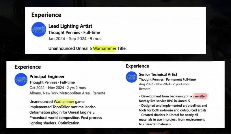 一份特别的简历将这款游戏描述为一款第三人称 “具有独特英雄角色和玩法风格的合作PvE动作角色扮演游戏”,融合了近战与远程战斗,在黑暗奇幻世界中设置了各种怪物敌人。虽然未提及《战锤》,但如果将黑暗奇幻这一描述与前文所述联系起来,显然指的就是这个系列。其他提及的细节更具技术性,比如加入了命中暂停和镜头抖动以增强战斗体验,以及沉浸式的穿墙动画。