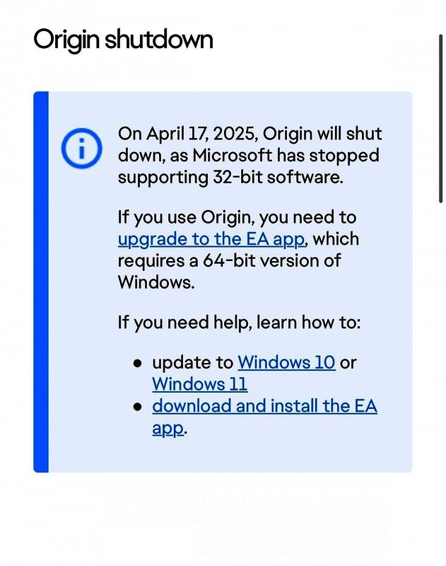 EA解释说,这是因为微软已经停止支持32位软件,Origin不再获得支持。EA App需要安装64位Windows 10/11。