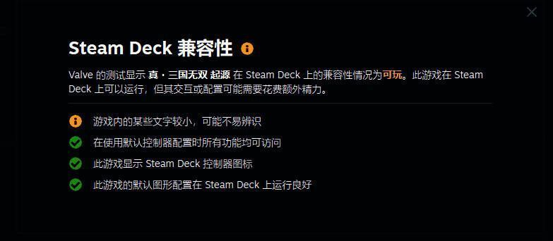 《真三国无双:起源》目前对Steam Deck的兼容性不算好,目前仅是“可玩”,尚未通过Steam Deck验证。