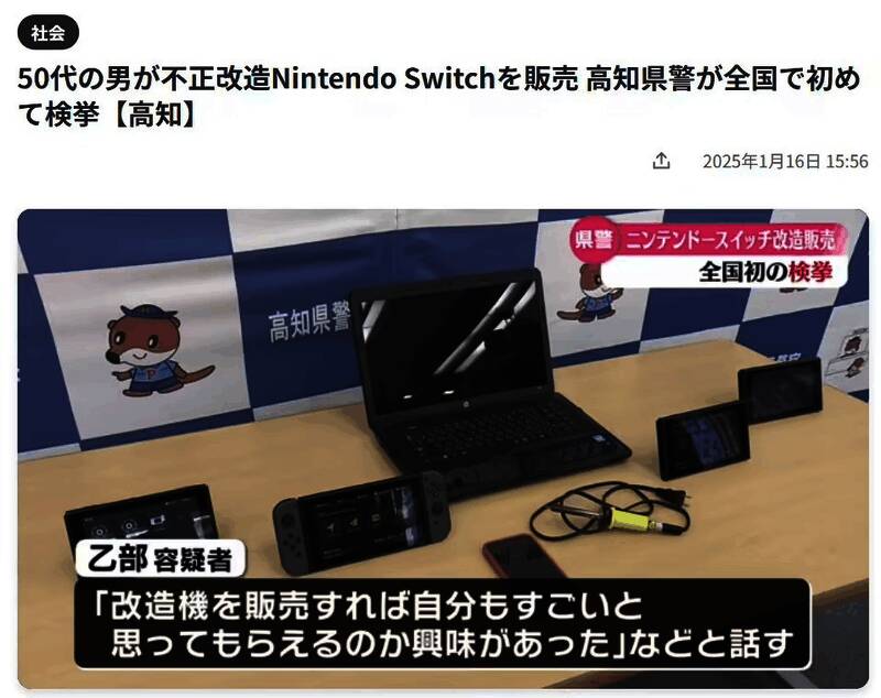 近日据NTV News报道,日本高知县警察逮捕了一名58岁的茨城县龙崎市运输业男性,理由是他销售了改造的Switch,涉嫌违反《商标法》。