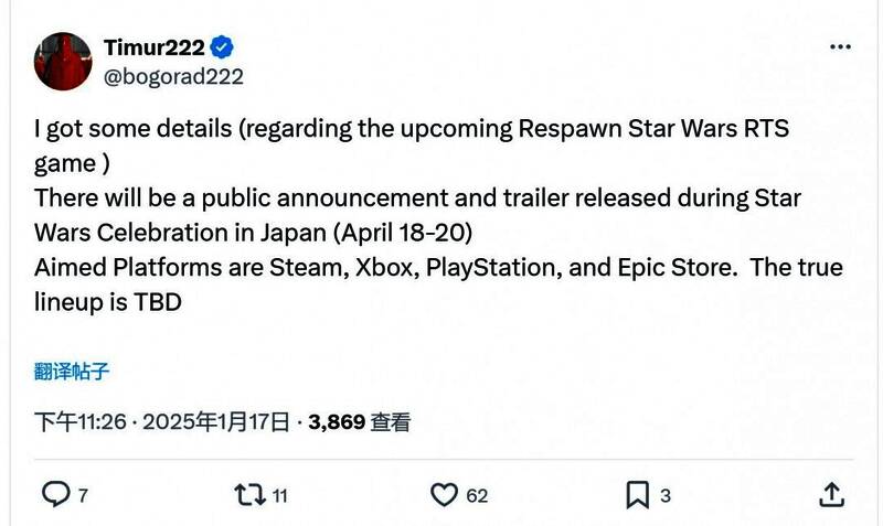 消息来自于X用户@bogorad222,他说重生的《星战》RTS新作将于在日本举行的星战庆典活动上公布并发布首支预告片,登陆PC(Steam,Epic),Xbox和PlayStation。星战庆典活动于4月18日-20日举行。