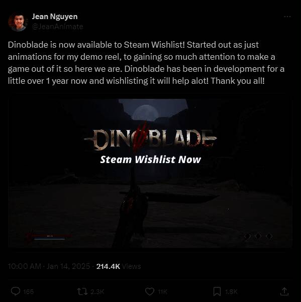 来自《对马岛之魂》团队的动画师Jean Nguyen,曾在2022年公布了一段由他制作的恐龙耍剑的3D动画,并引起了部分玩家的注意,当时就有玩家追问这是什么游戏。