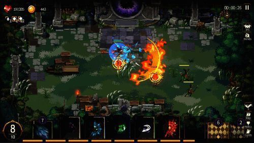 开局出生在一张像素风地图中、陆续四面八方袭来怪物、角色自动寻敌攻击、羁绊搭配增强,听介绍以为是自走棋游戏?再操作一下,打牌弃牌洗牌、费点热力值上限、咒语升级合成、还有全局圣物、也是层层打怪爬塔!这很杀戮尖塔。