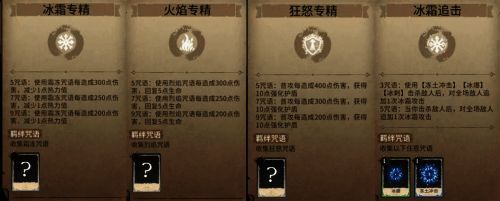 游戏中咒语有着不同的羁绊,收集同一羁绊咒语可以触发羁绊效果,数量越多效果越强。例如,烈焰咒语回血的火焰专精、霜冻咒语降低热力值的冰霜专精、普攻加盾的狂怒专精、增强召唤物的随从专精。