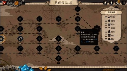 游戏关卡为爬塔闯关,在一张2D横版地图上选择前进的路径,分布着战场、死斗、奇遇、秘市、财宝、篝火不同房间。普通怪的战场、精英怪的死斗,战斗胜利获得新的咒语和金钱。金钱可以在迷市购买圣物、咒语。玩家在篝火处,可以选择回血、升级、删除或者改写咒语。奇遇则会出现随机事件。