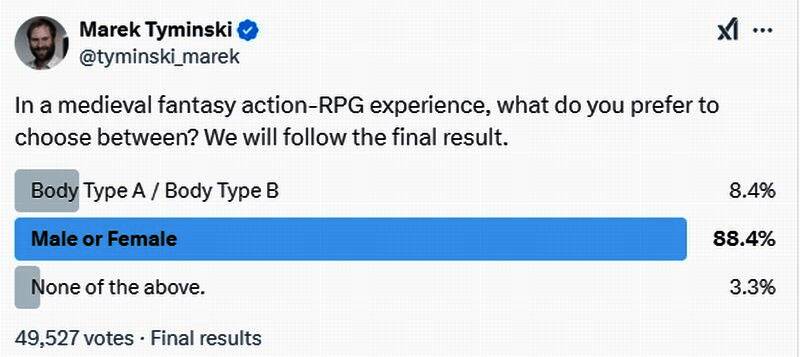 投票有近5万名玩家参与,CI Games负责人Marek Tymiński对投票结果进行了总结:88.4%的玩家投票支持游戏回归传统的男/女性代词选项。而所谓的体型A/B代词仅获得8.4%的支持。