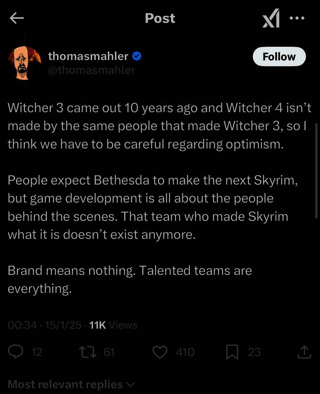 多次公开批评DEI和政治正确的《奥日》游戏总监Thomas Mahler,谈到了自己对《巫师4》的看法。