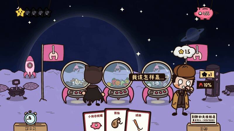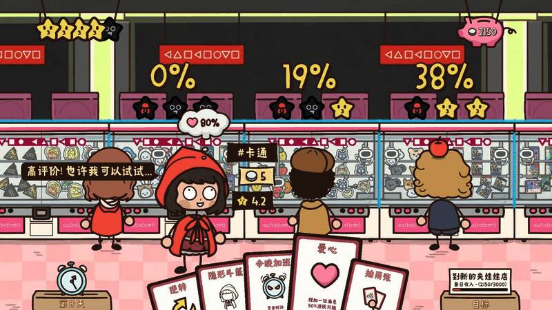 每开始一天的游戏,你会有新的每日收入目标。如果你达到目标,下一天就可以到新的地方开一间夹娃娃机店!每天结束后,你可以选择解锁一张新卡片,并从商店购买额外的卡片。通过收集卡片,你可以改装你的夹娃娃机,并解锁新的功能卡使用。