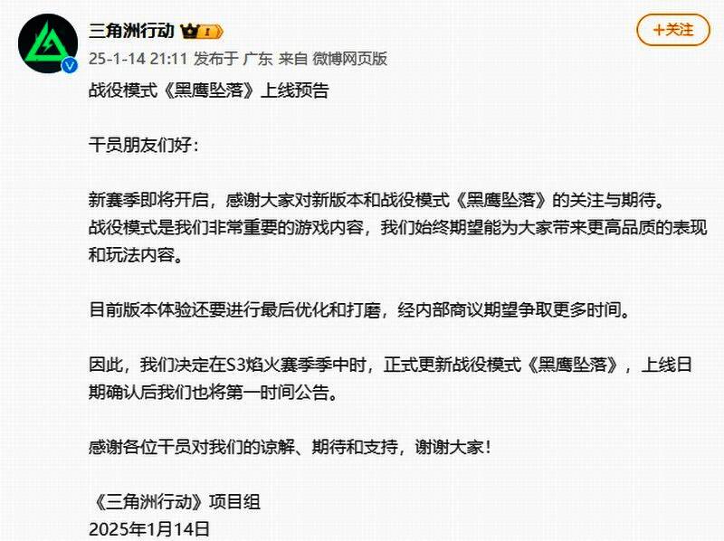 之前《三角洲行动》官方宣布,战役模式“黑鹰坠落”将于1月上线PC端。近日官方发布公告称,战役模式是重要内容,他们想为玩家带来更高品质的表现和玩法内容。目前还需进行优化打磨,因此决定在S3焰火赛季季中时,正式更新战役模式《黑鹰坠落》。注:焰火赛季已正式上线。