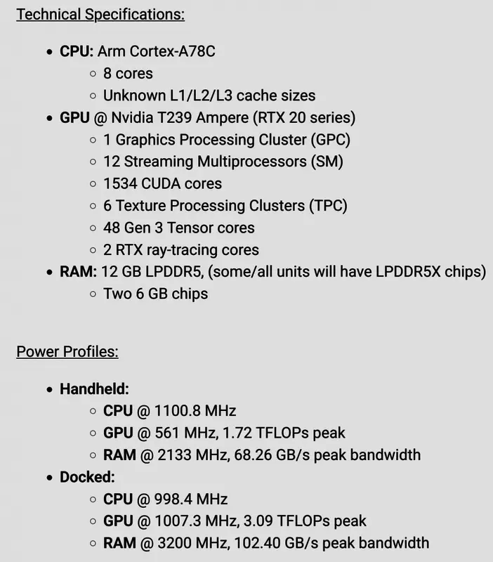 任天堂Switch 2的保密工作看起来做得不太好。此前已有多家媒体称已经得到消息,称Switch 2将于1月16日公布,5/6月发售。而今天又有新的泄露出现,这一次是机器的计算性能。据悉,Switch 2掌机模式GPU时钟速度为561Mhz,1.71TFLOPS,底座模式下,GPU时钟速度翻倍,达到1000Mhz,3.1TFLOPS。
