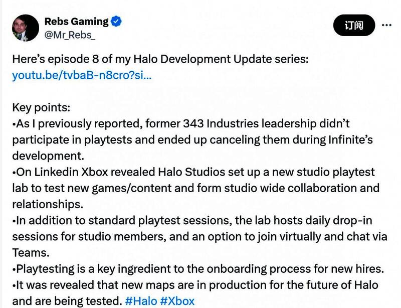 Rebs Gaming在X上称,《光环》未来新作的开发进度已经足以“每周”都进行测试。当前还在开发多个新地图。