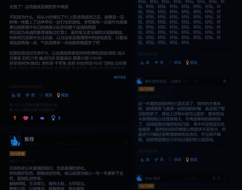 也有玩家称赞剧情,“这一作真的是很好的三国无双了,独特的主角系统,剧情里张飞邀请一起结拜的时候,真是圆了蜀汉粉的梦了,再加上还有IF线可以圆梦,整体的战斗系统相较以往替身很大,不再是单纯的刷刷刷了,战场氛围也做的相当的美。”