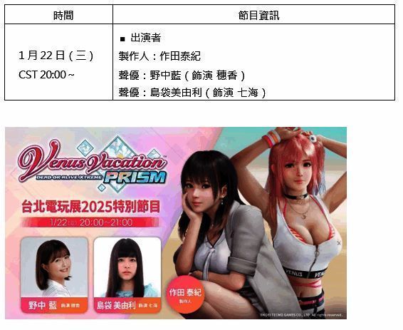 台湾光荣特库摩宣布,2025年1月23日(四)~1月26日(日)为期四天于台北南港展览馆 1 馆(台北市南港区)举行的「2025 台北国际电玩展」(以下简称: TpGS2025),摊位编号为 M731,本日公开『优米雅的炼金工房 ~追忆之炼金术士与幻创之地~』及『Venus Vacation PRISM –DEAD OR ALIVE Xtreme』2025 台北国际电玩展特别节目,并公开现场摊位展出活动内容,以及参加活动好礼。