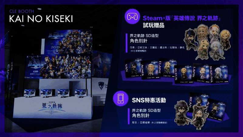 ★「特典 1」:台北电玩展期间在云豹娱乐摊位完成试玩「英雄传说 界之轨迹-告别塞姆利亚-」的玩家,将可获得特制「界之轨迹 SD 造型角色别针」乙个(一共 6 款随机赠送)!