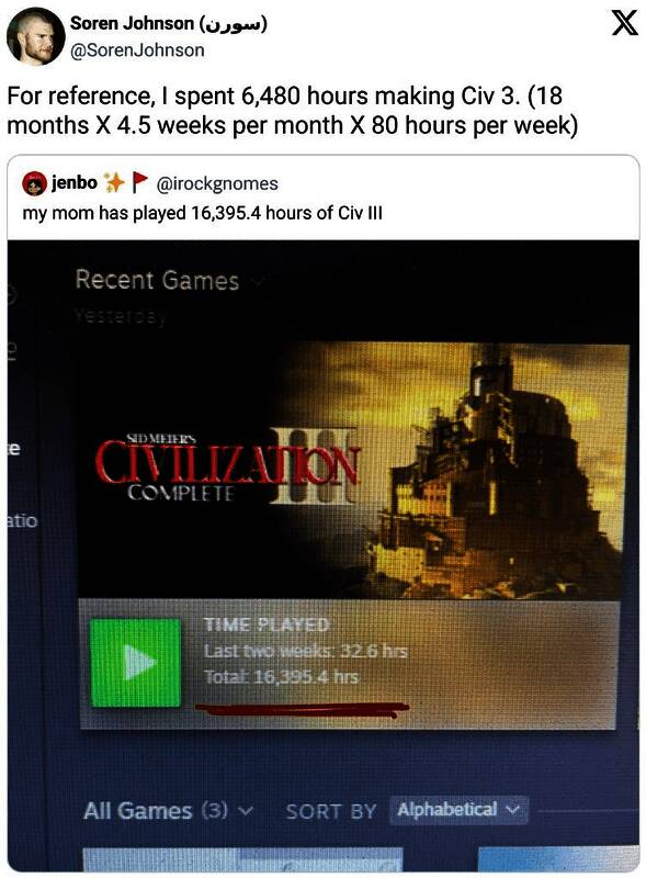 Johnson表示:“我们花了6480个小时制作《文明3》。这意味这位母亲的游玩时间比我们制作这款游戏所花费的时间还要多。我们现在有了值得尊敬的《文明3》母亲,还有《天际》奶奶。”