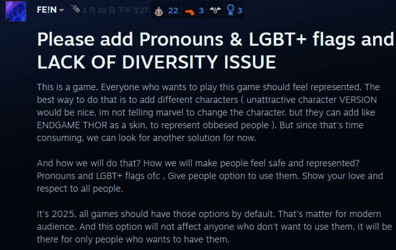 许多玩家认为《漫威争锋》这么火爆,是因为游戏本身很好玩,加上漫威粉丝众多,没有DEI元素等。然而一些LGBT+群体玩家开始不满起来,他们在《漫威争锋》Steam社区发帖,强烈要求网易添加LGBT皮肤,并增加代词选择等。