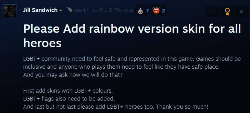 “LGBT+群体需要在游戏中感受到代入感和安全感。游戏应该是包容性的,所以请添加LGBT皮肤。还要添加LGBT旗帜,LGBT英雄。非常感谢!”