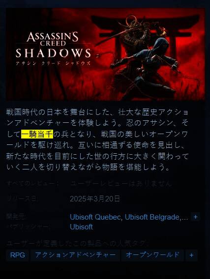 《刺客信条:影》日本地区的Steam页面上,育碧修改了关于弥助的描述,将其从“武士”改为“Ikki Tousen”(一骑当千的强大战士)。育碧将弥助比作传奇战士,其实力可与三国时代的英雄相媲美?