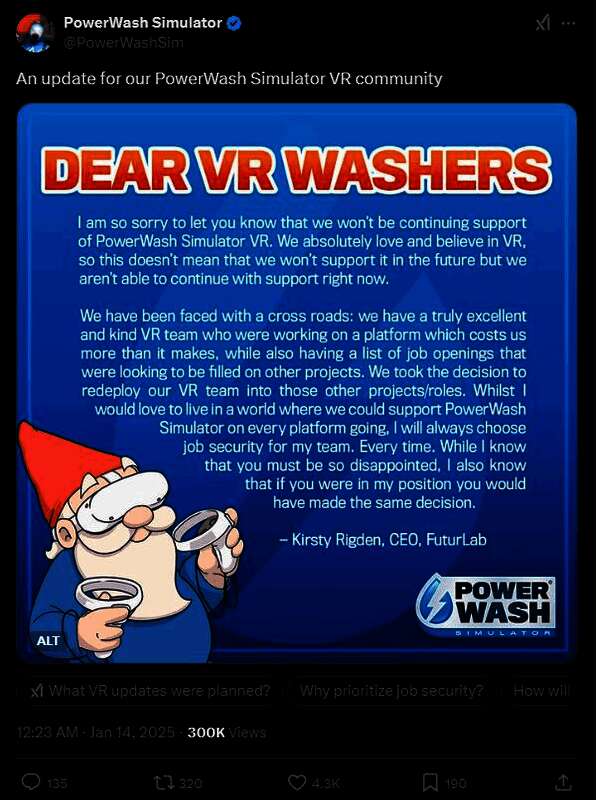 因此FuturLab的VR团队现已重新部署到“其他项目/角色”上。Rigden总结道:“虽然我希望生活在一个可以在所有平台上支持《冲就完事模拟器》的世界里,但我会始终为我的团队选择工作保障。每一次。虽然我知道你一定非常失望,但我也知道,如果你处于我的位置,你也会做出同样的决定。”