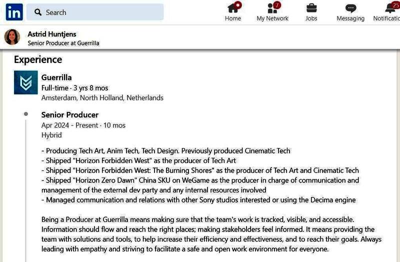 Huntjens自2024年4月起担任Guerrilla Games高级制作人,她负责与使用或对使用Decima引擎感兴趣的其他索尼工作室进行沟通和关系管理。而Decima引擎是用于开发《地平线: 西之绝境》和《死亡搁浅2》的图形引擎。