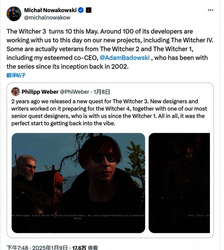 Nowakowski转发了《巫师4》叙事总监Philipp Weber的一条推文时透露了以上消息,Weber当时正在庆祝《巫师3》最新任务推出两周年。