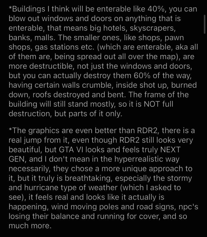 虽然这个系统不会提供完全可破坏的环境,但粉丝们可以期待看到破碎的墙壁、烧毁的屋顶以及地图上的即时破坏。值得注意的是,《GTA4》也提供了一些类似的破坏元素,但规模要小得多。从那时起,粉丝们就一直希望看到R星进化这一系统,而《GTA6》似乎就将做到这一点。