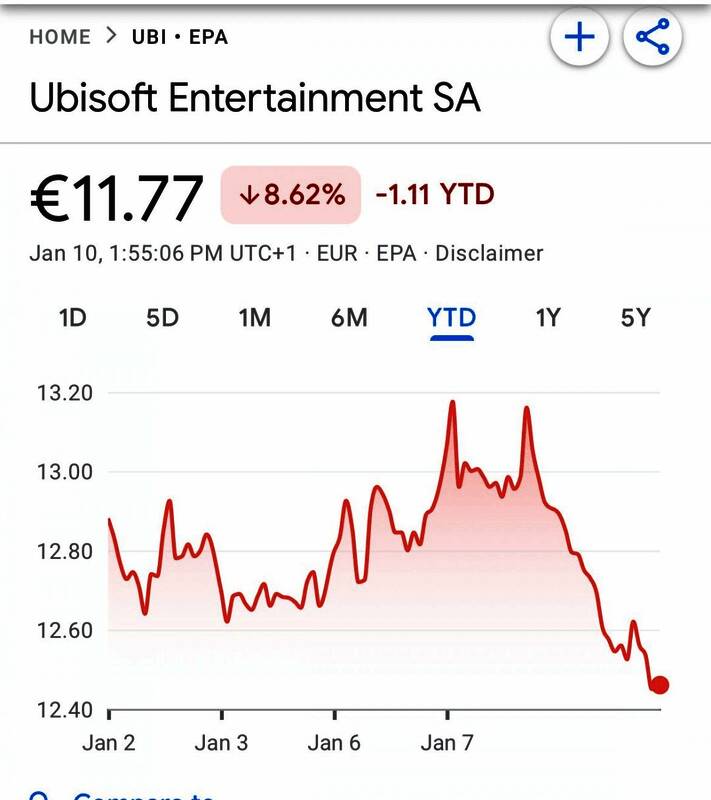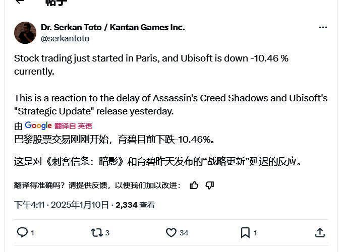 育碧前脚刚发布完公司的战略更新,后脚就迎来了股价再跌的消息。据Kantan Games分析师Dr. Serkan Toto,育碧股价下跌了10.46%,这是对《刺客信条:影》和育碧“战略更新”的回应。