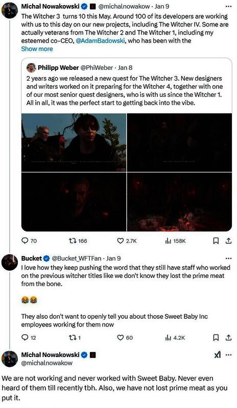 之后有玩家质疑道:“CDPR一直在宣传他们仍有参与了《巫师》系列前几部作品制作的老员工,就好像我们不知道CDPR已失去了重要核心成员一样。而且他们也不想公开告诉你,那些为他们工作的Sweet Baby Inc员工的情况。”