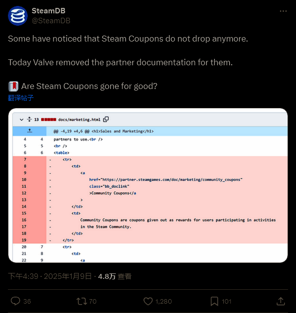 根据 Steam 后台数据跟踪平台 SteamDB 分享,Valve似乎在没有任何统治的情况下,移除了 Steam 优惠券功能。
