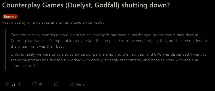 他分享了另一家游戏工作室 Jackalyptic 的员工在领英上发布的帖子。帖子写道:“在过去六个月左右的时间里,我们在Jackalyptic的项目得到了 Counterplay Games 世界级开发人员的大力支持。它们的影响怎么强调都不为过。从第一天起,他们就投入一切,就像这是他们的孩子一样。”
